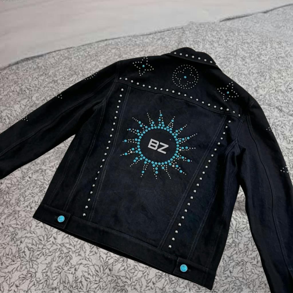 Crafted in deep black with hand-placed rhinestone and stud detailing, this jacket features bold geometric and celestial motifs across the front, sleeves, and back. The signature BZ sun-orbit emblem at the back represents power, dominance, and controlled energy — a true symbol of authority.