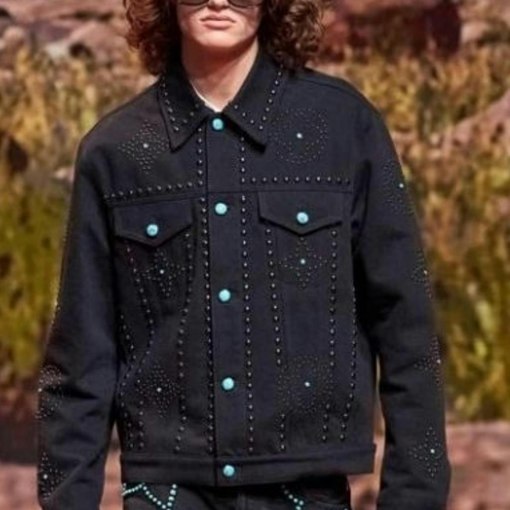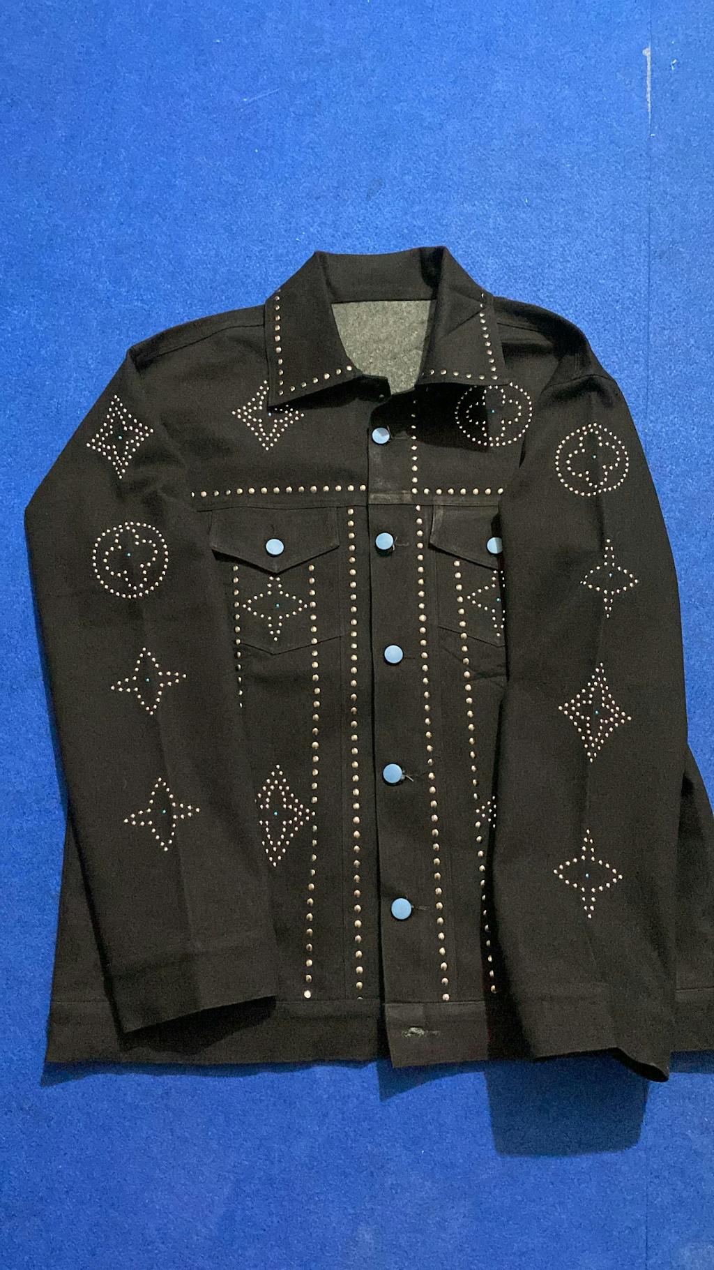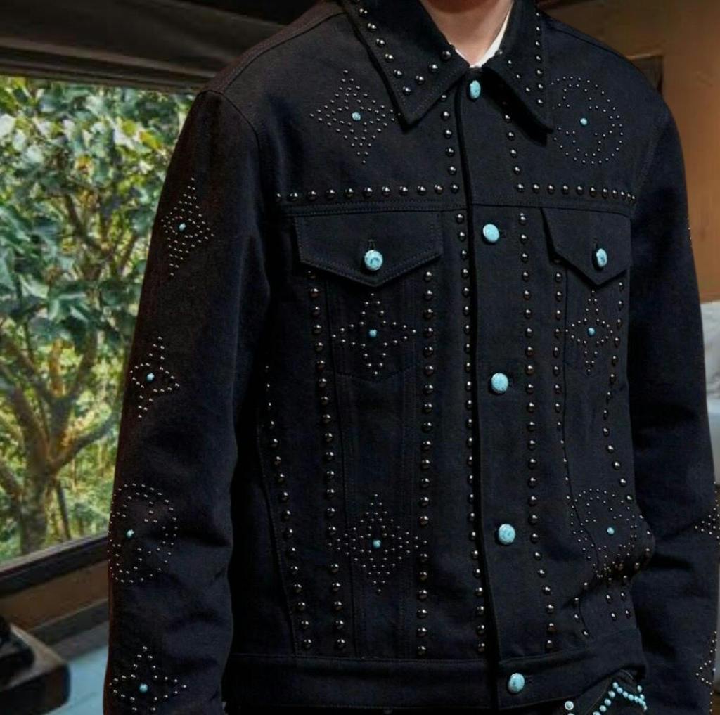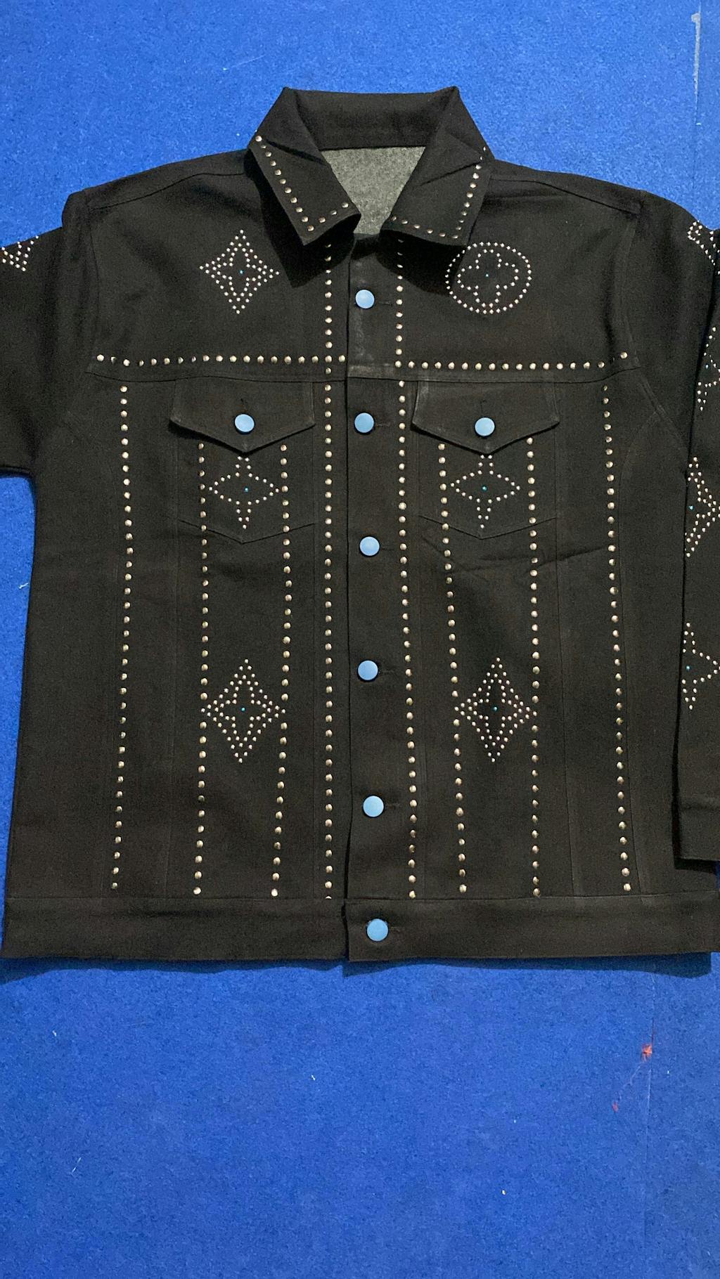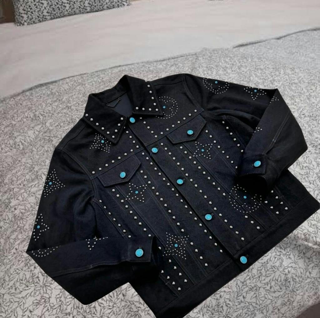 Finished with contrasting turquoise accents and precision stud work, this jacket blends luxury streetwear with high-fashion craftsmanship. Wear it solo or pair it with the matching coord bottoms for a complete power look.