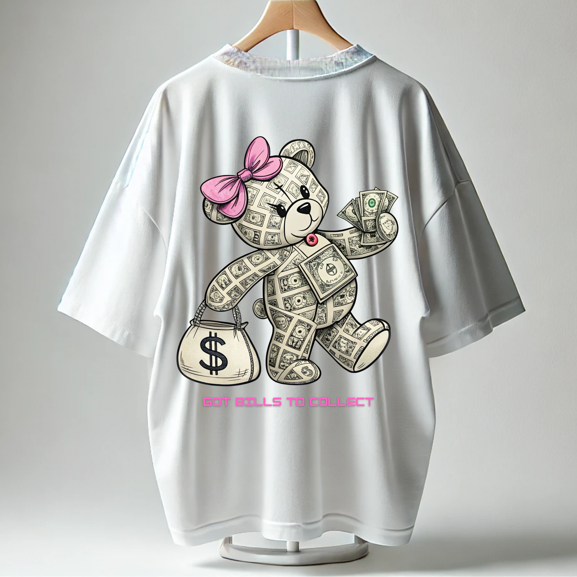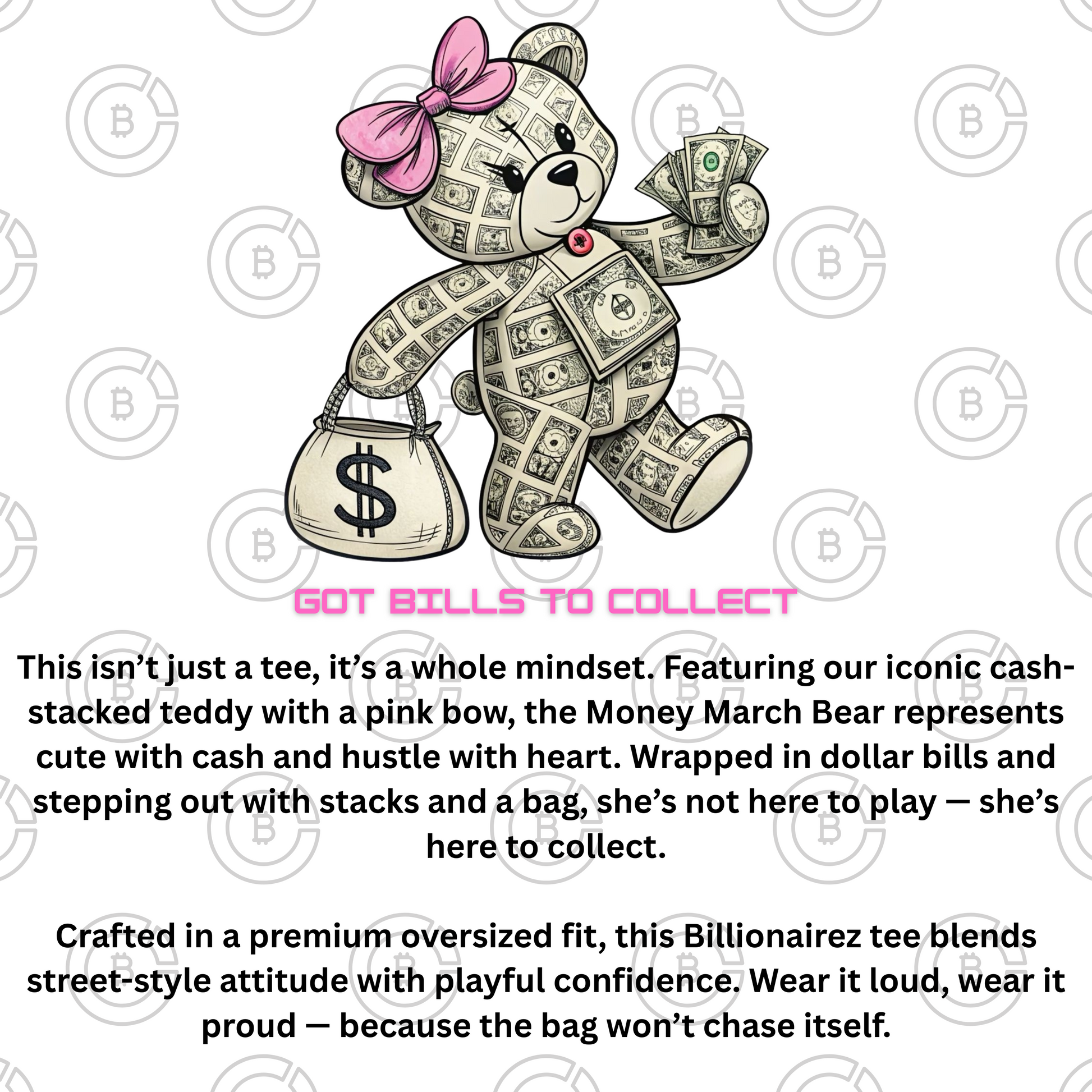This isn’t just a tee, it’s a whole mindset. Featuring our iconic cash-stacked teddy with a pink bow, the Money March Bear represents cute with cash and hustle with heart. Wrapped in dollar bills and stepping out with stacks and a bag, she’s not here to play — she’s here to collect.