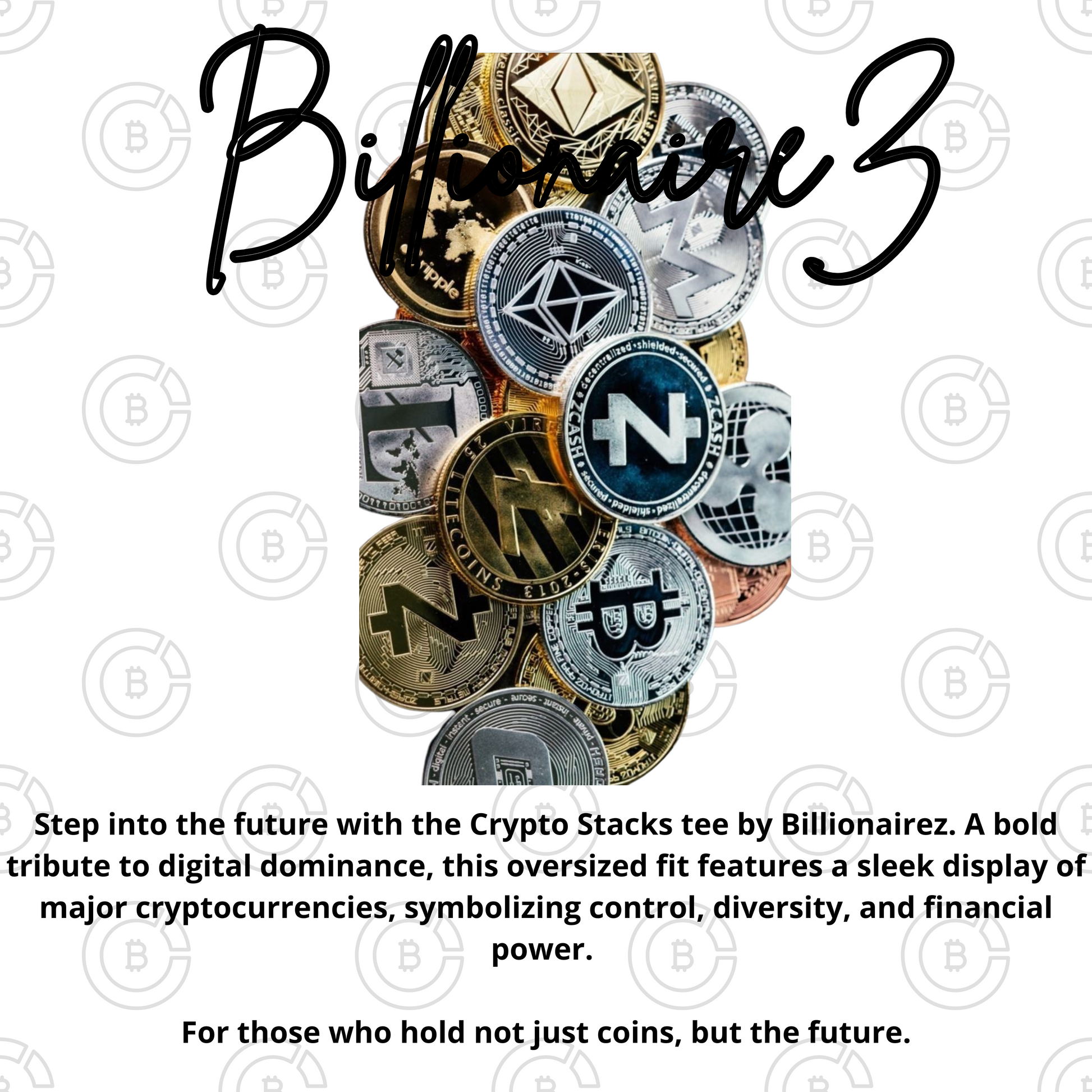 Step into the future with the Crypto Stacks tee by Billionairez. A bold tribute to digital dominance, this oversized fit features a sleek display of major cryptocurrencies, symbolizing control, diversity, and financial power. For those who hold not just coins, but the future.