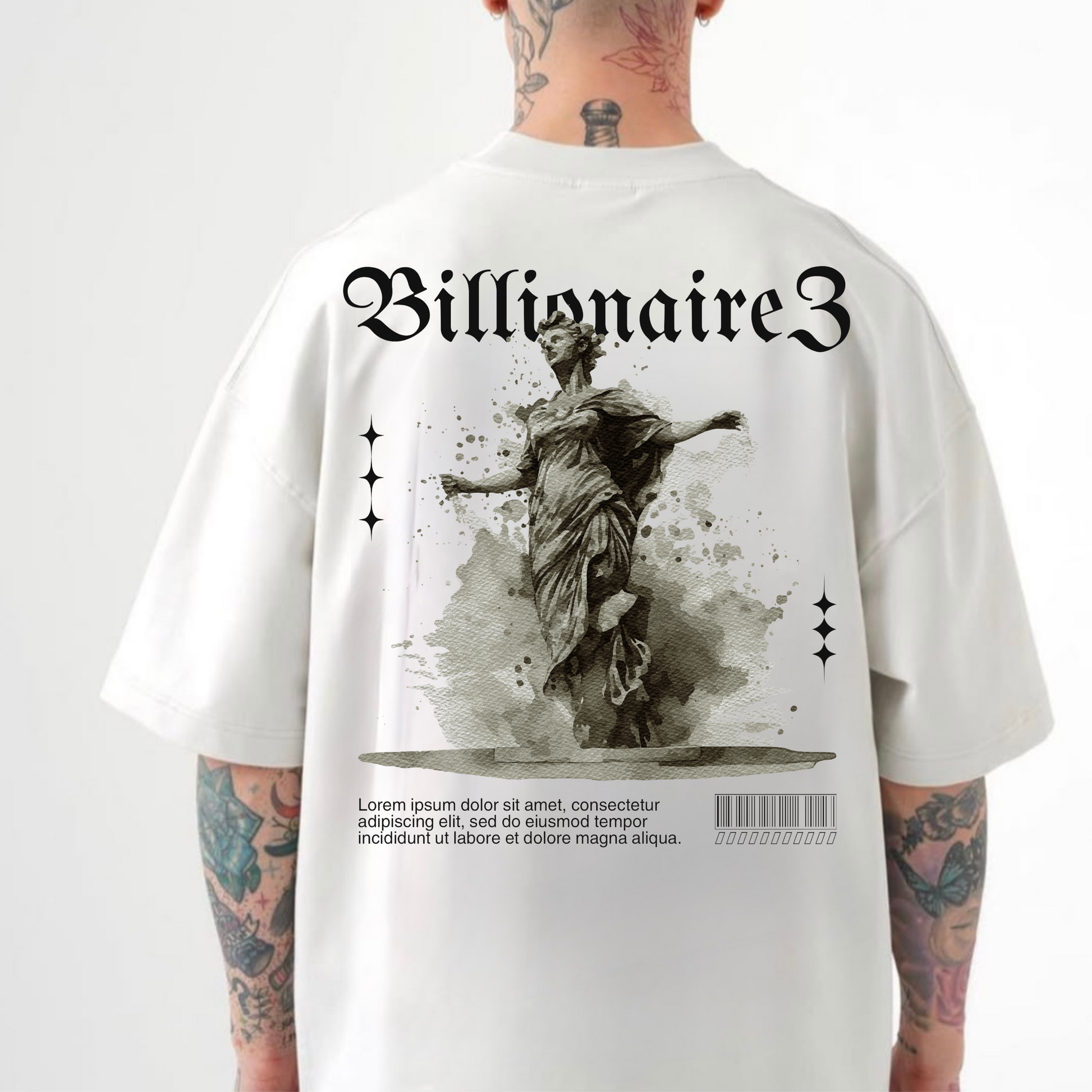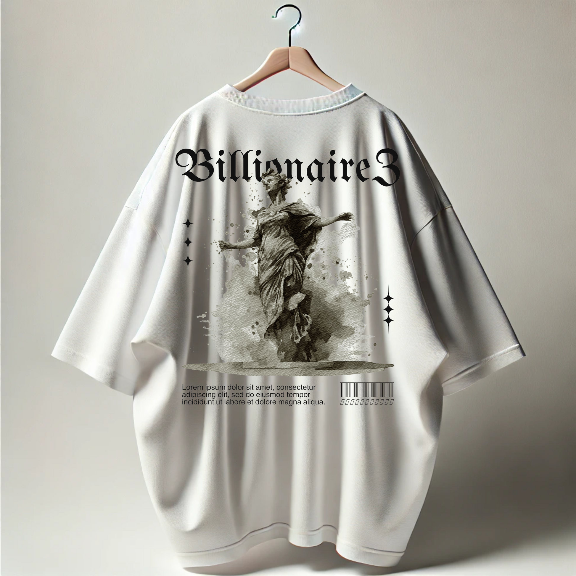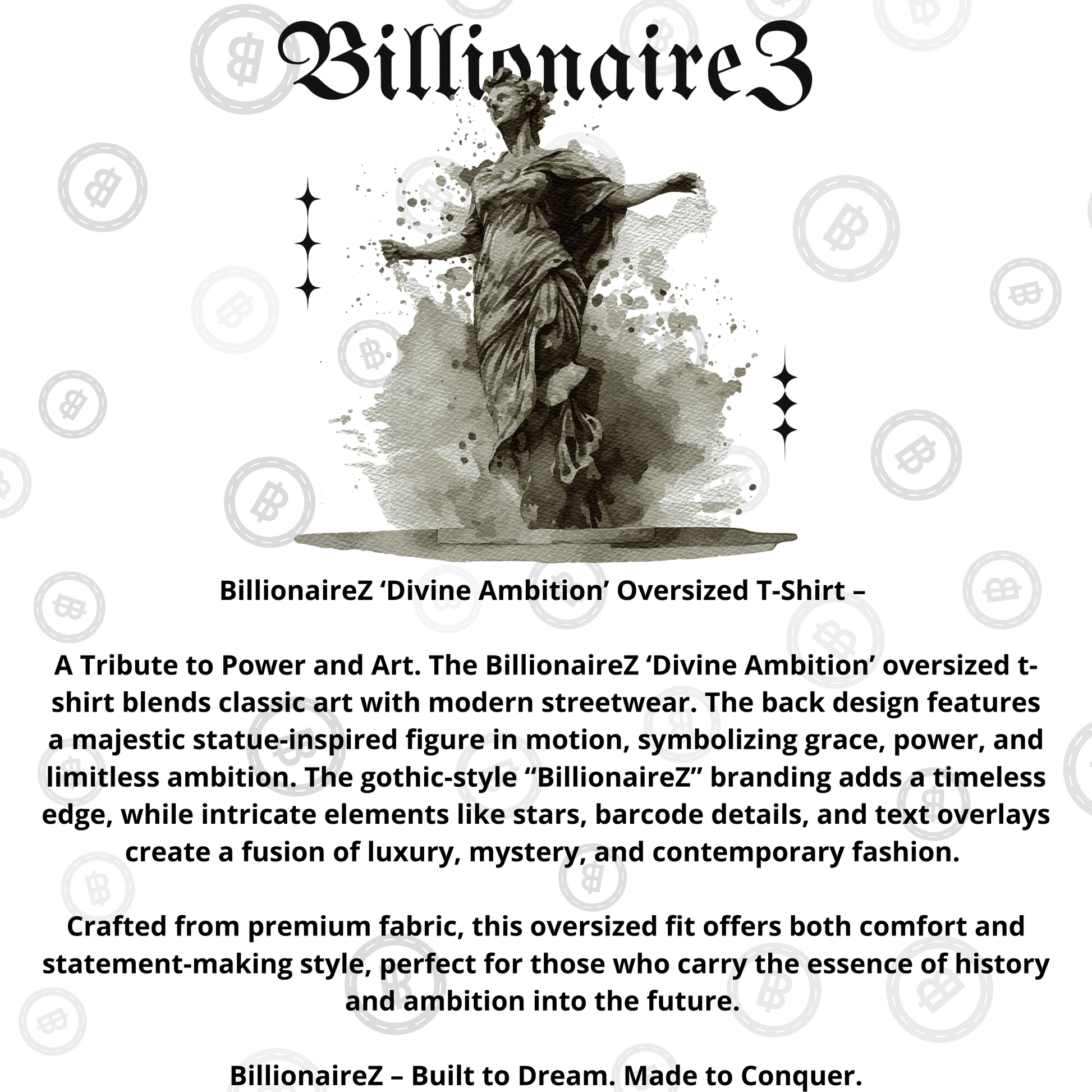 BillionaireZ ‘Divine Ambition’ Oversized T-Shirt – A Tribute to Power and Art. The BillionaireZ ‘Divine Ambition’ oversized t-shirt blends classic art with modern streetwear. The back design features a majestic statue-inspired figure in motion, symbolizing grace, power, and limitless ambition. The gothic-style “BillionaireZ” branding adds a timeless edge, while intricate elements like stars, barcode details, and text overlays create a fusion of luxury, mystery, and contemporary fashion. Crafted from premium fabric, this oversized fit offers both comfort and statement-making style, perfect for those who carry the essence of history and ambition into the future. BillionaireZ – Built to Dream. Made to Conquer.