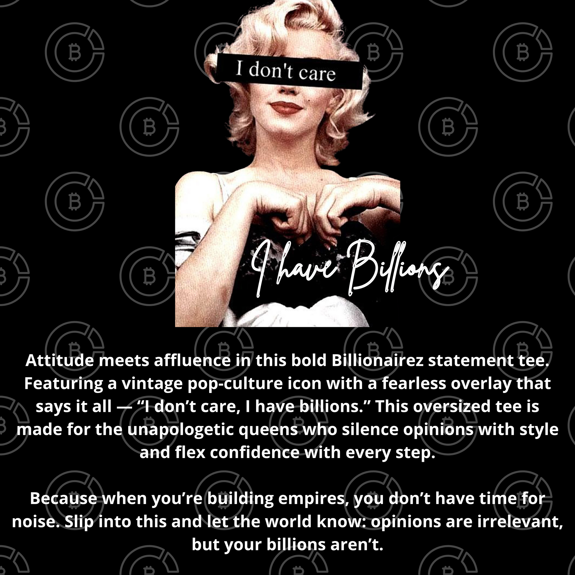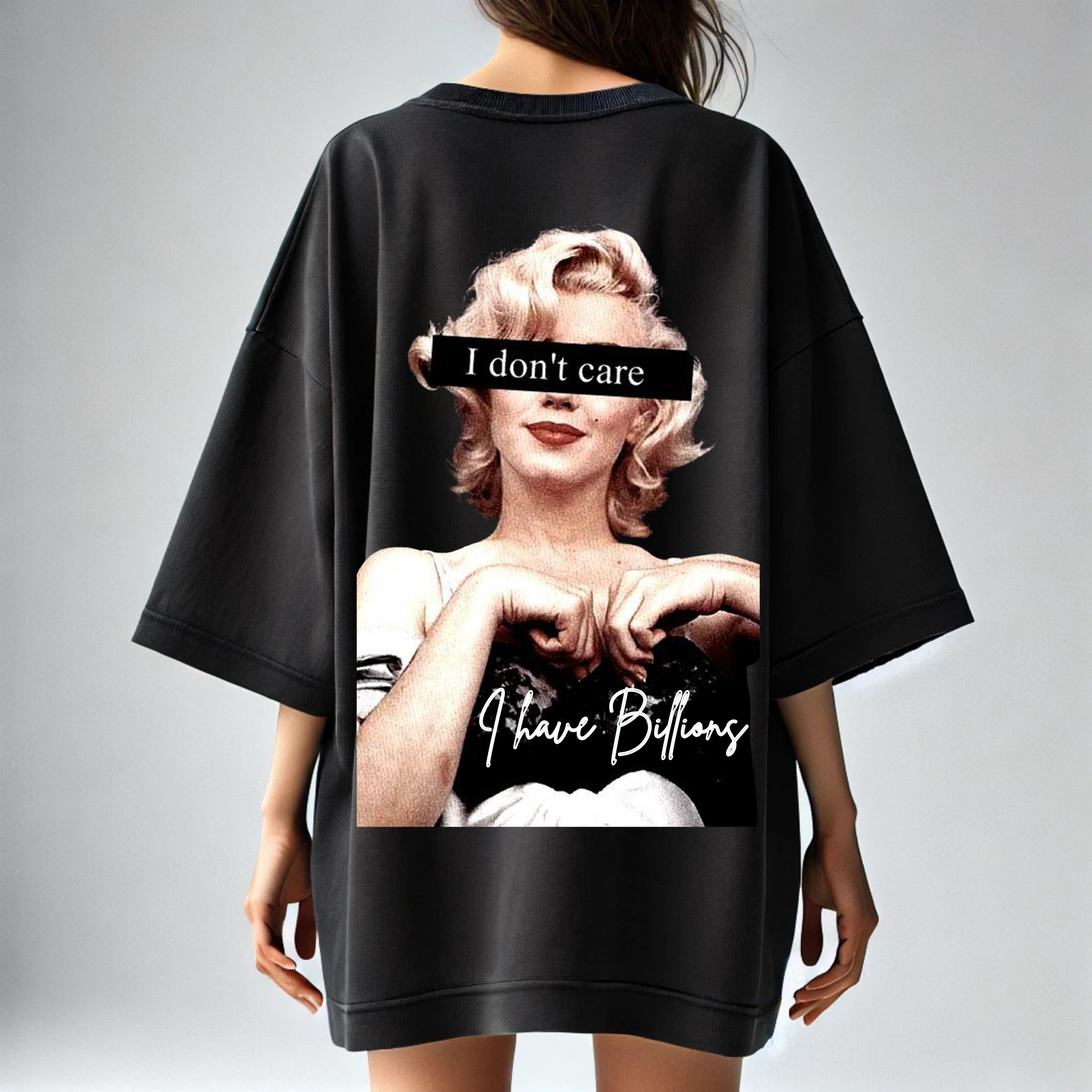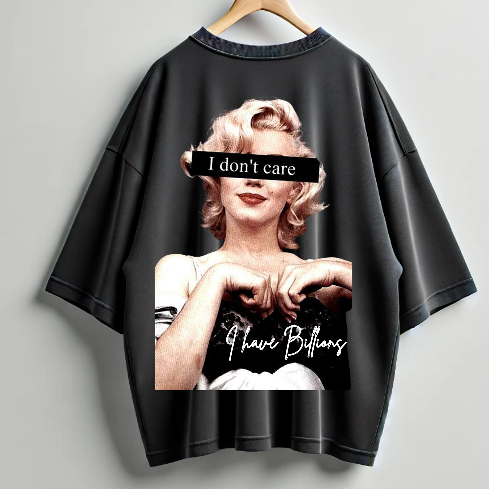 Attitude meets affluence in this bold Billionairez statement tee. Featuring a vintage pop-culture icon with a fearless overlay that says it all — “I don’t care, I have billions.” This oversized tee is made for the unapologetic queens who silence opinions with style and flex confidence with every step.
