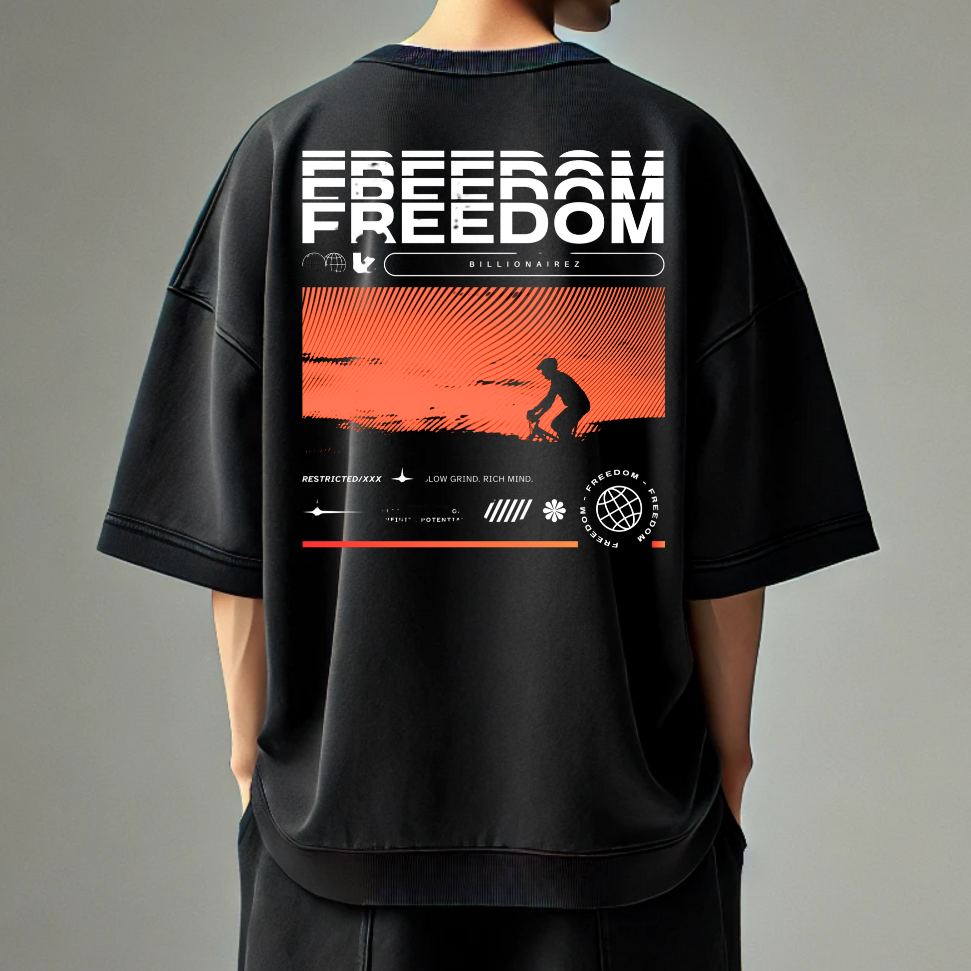 Unleash your inner rebel with the Freedom Flex tee by Billionairez. A bold oversized silhouette meets a rich sunset-toned graphic, symbolizing unrestricted ambition and limitless style. For those who carve their own path — with a low grind and a rich mind.