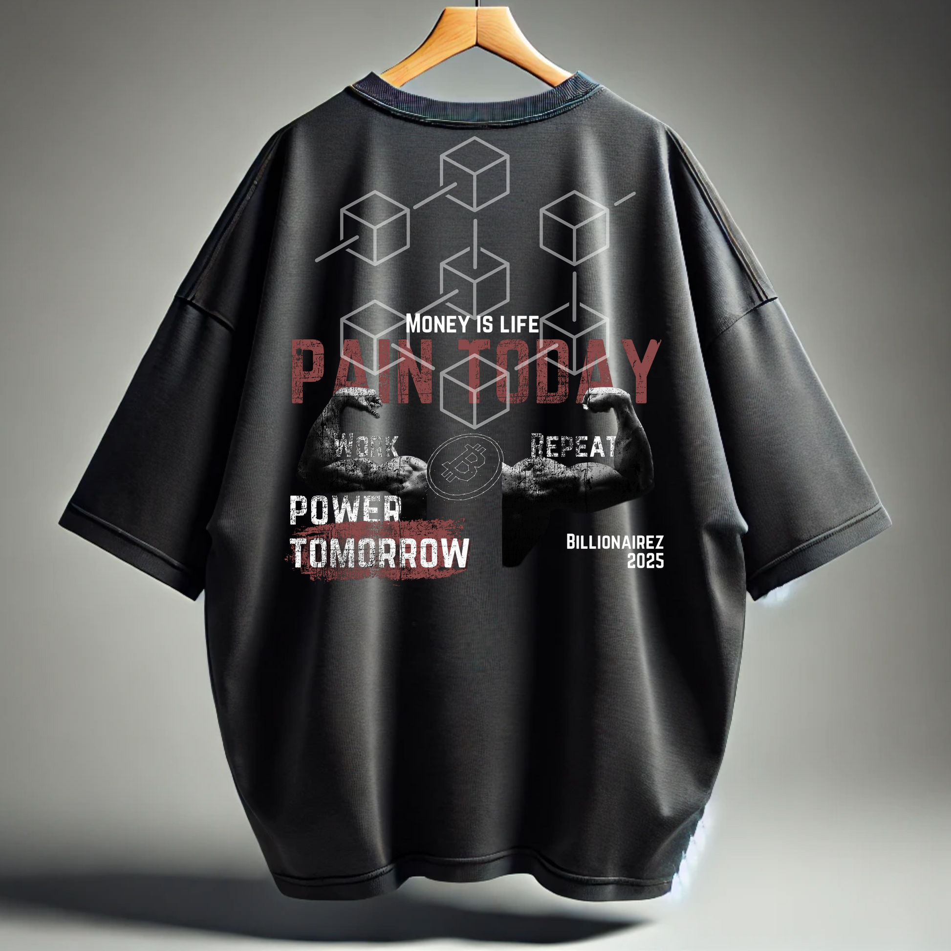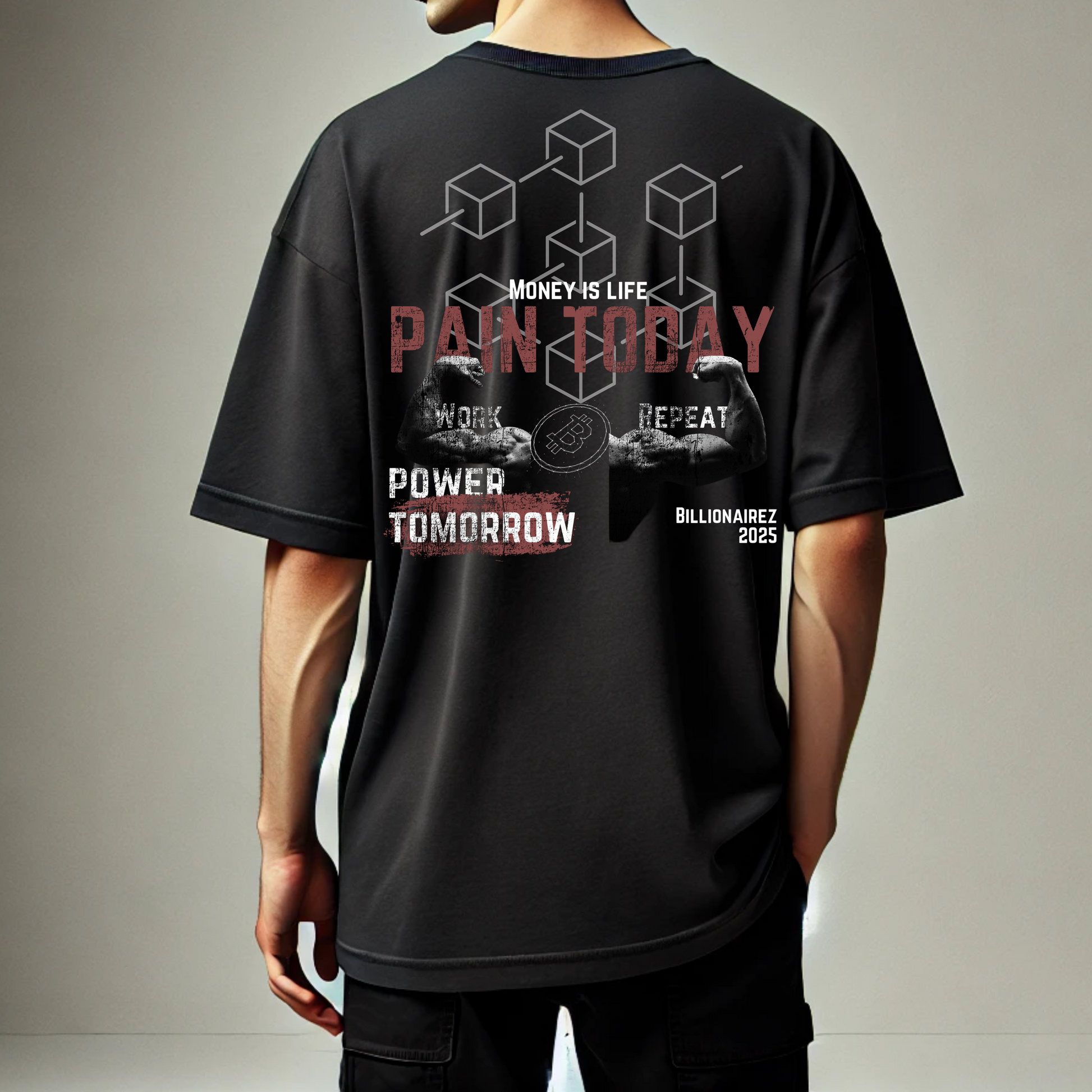 Embody the grind with the Pain Today, Power Tomorrow oversized T-shirt from BillionaireZ. Designed for hustlers and visionaries, this bold tee features a striking back print with muscular strength, blockchain elements, and motivational text—a reminder that hard work today leads to power and success tomorrow. Crafted from premium fabric, its relaxed oversized fit ensures maximum comfort while making a powerful statement. Keep pushing, keep building—because money is life, and power is the reward.