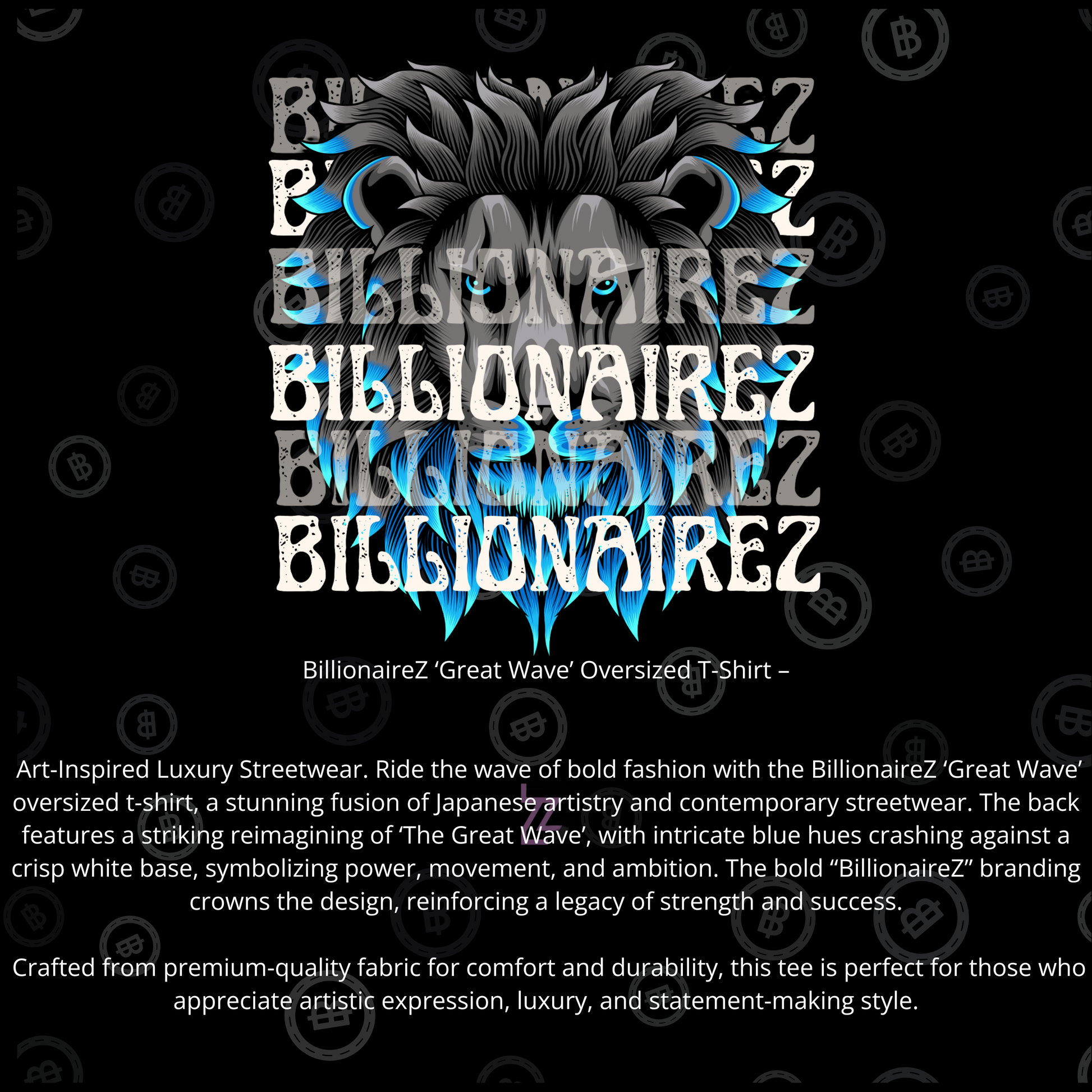 BillionaireZ ‘Great Wave’ Oversized T-Shirt – Art-Inspired Luxury Streetwear. Ride the wave of bold fashion with the BillionaireZ ‘Great Wave’ oversized t-shirt, a stunning fusion of Japanese artistry and contemporary streetwear. The back features a striking reimagining of ‘The Great Wave’, with intricate blue hues crashing against a crisp white base, symbolizing power, movement, and ambition. The bold “BillionaireZ” branding crowns the design, reinforcing a legacy of strength and success. Crafted from premium-quality fabric for comfort and durability, this tee is perfect for those who appreciate artistic expression, luxury, and statement-making style.