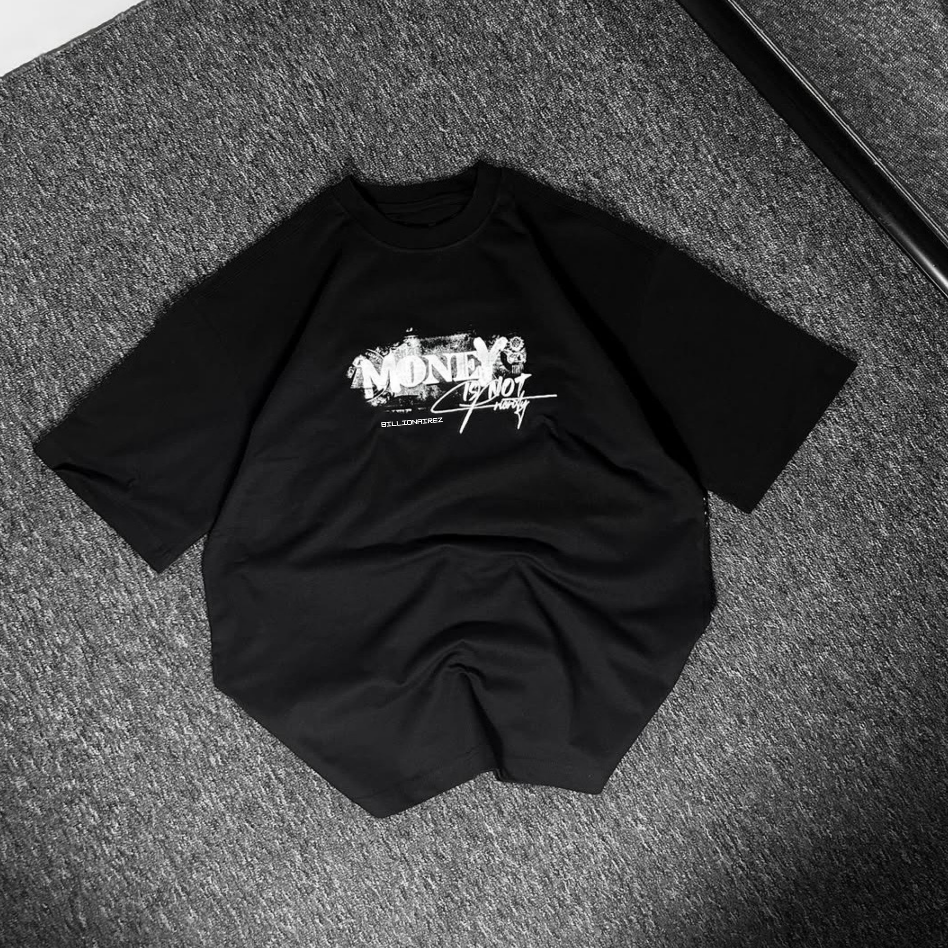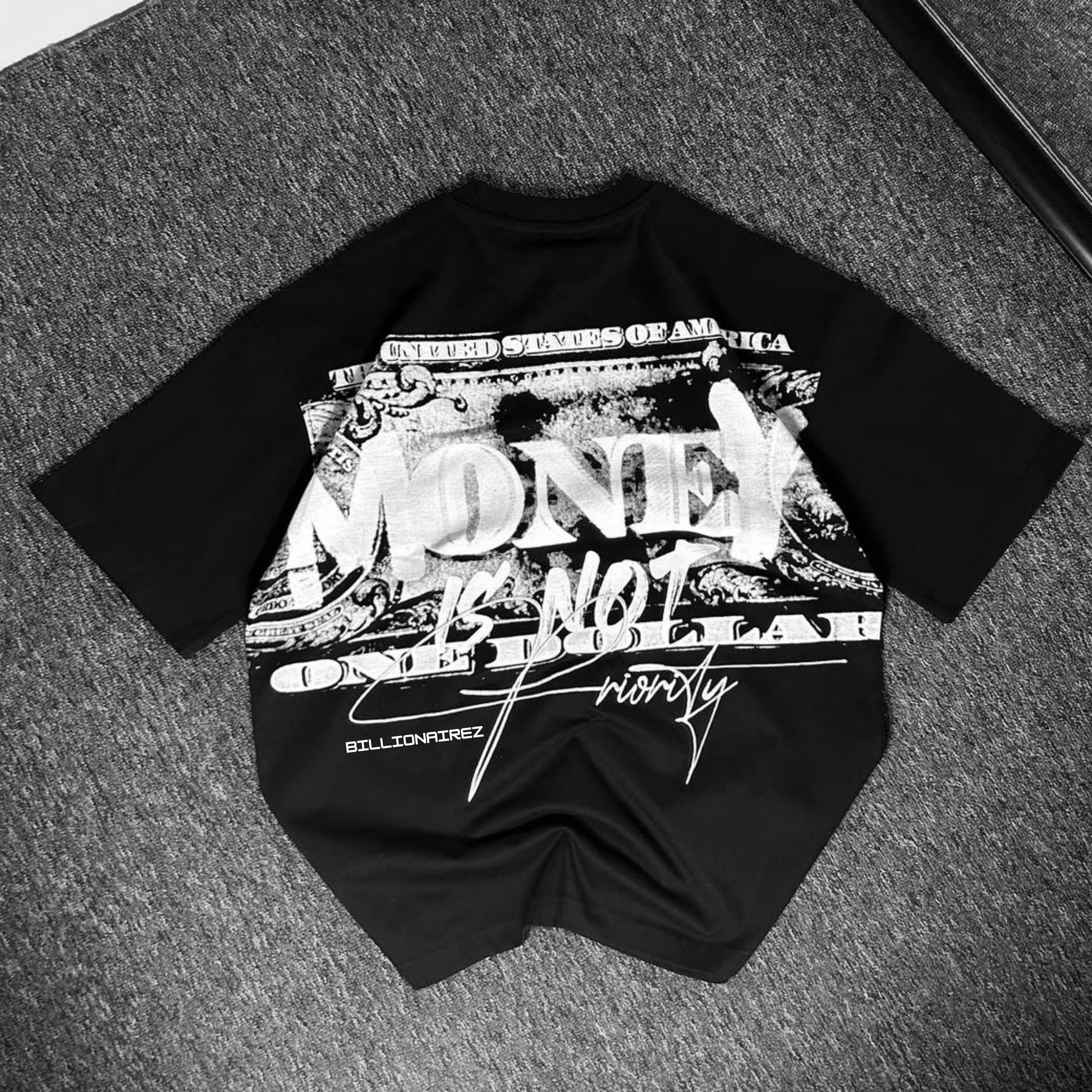 The BillionaireZ® “Money Is Not Priority” Oversized Tee is designed for those who value purpose over paper. Featuring a powerful back graphic inspired by the iconic U.S. dollar layout, the tee blends raw street culture with a luxury aesthetic. The distressed MONEY typography, signature BillionaireZ script, and bold statement print create a piece that speaks truth in a world obsessed with flexing.