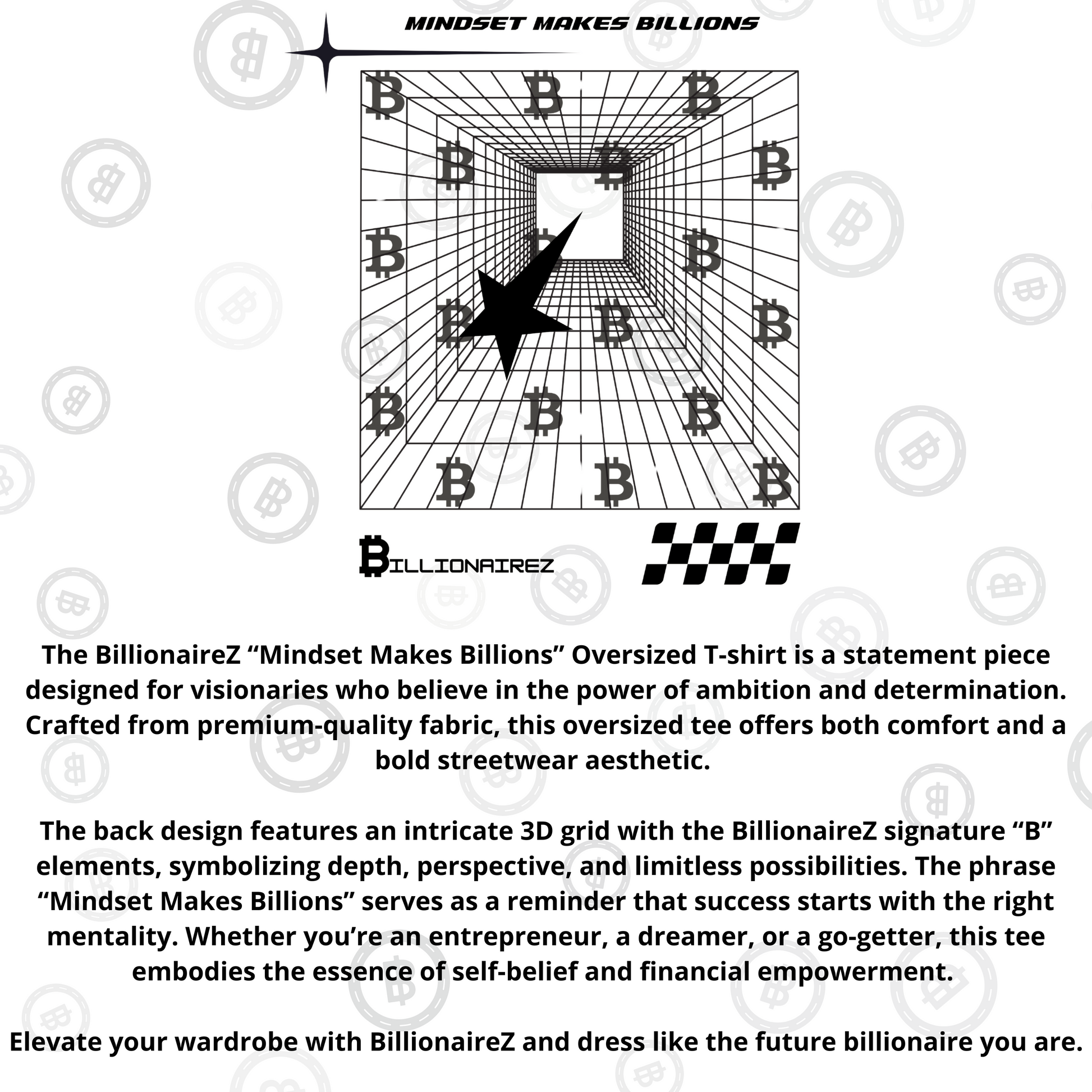 The BillionaireZ “Mindset Makes Billions” Oversized T-shirt is a statement piece designed for visionaries who believe in the power of ambition and determination. Crafted from premium-quality fabric, this oversized tee offers both comfort and a bold streetwear aesthetic. The back design features an intricate 3D grid with the BillionaireZ signature “B” elements, symbolizing depth, perspective, and limitless possibilities. The phrase “Mindset Makes Billions” serves as a reminder that success starts with the right mentality. Whether you’re an entrepreneur, a dreamer, or a go-getter, this tee embodies the essence of self-belief and financial empowerment. Elevate your wardrobe with BillionaireZ and dress like the future billionaire you are.