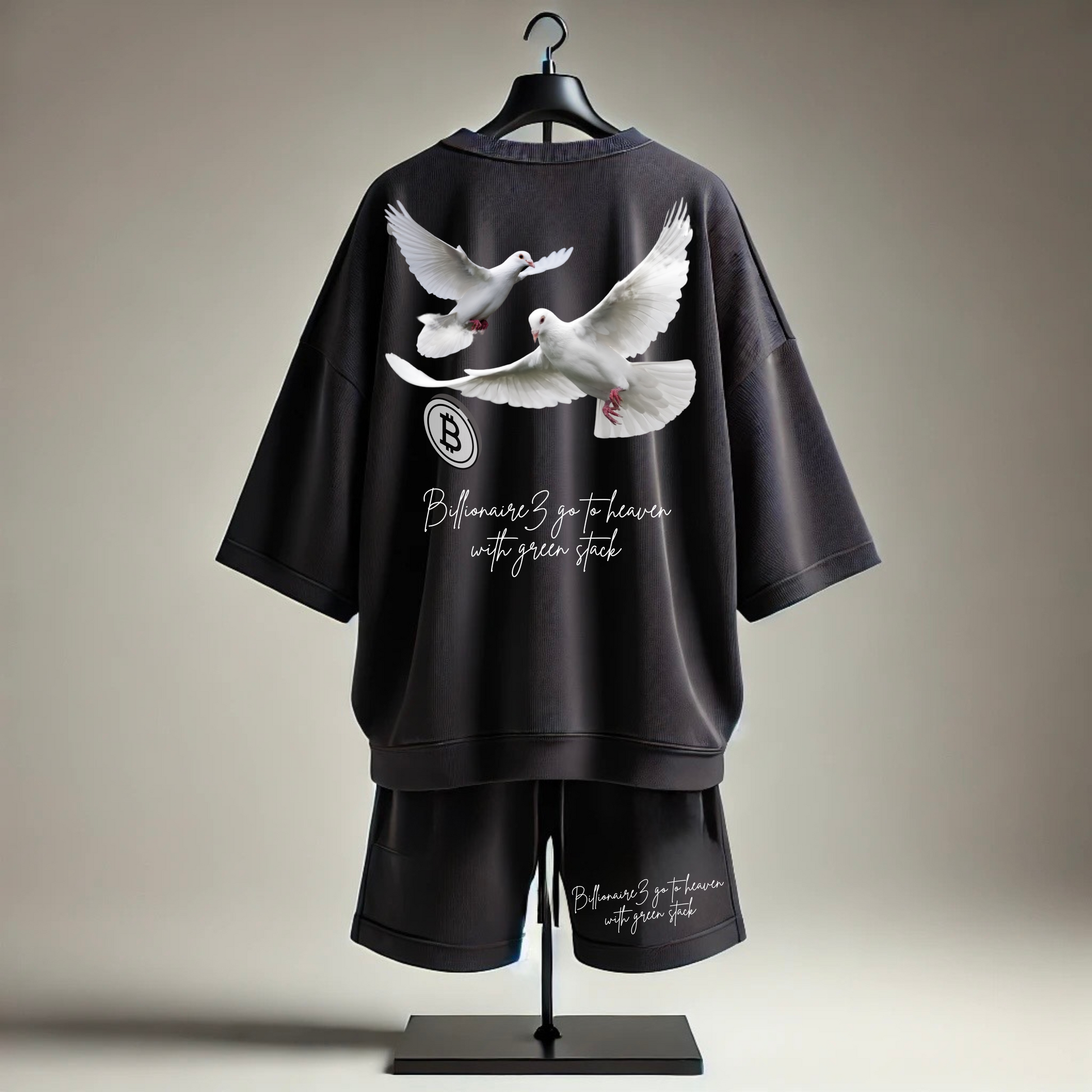 Elevate your look with the BillionaireZ ‘Heavenly Wealth’ Oversized T-Shirt, a symbol of peace, prosperity, and ambition. This exclusive design features two majestic white doves in flight, embodying freedom, purity, and elevation, alongside the bold inscription: