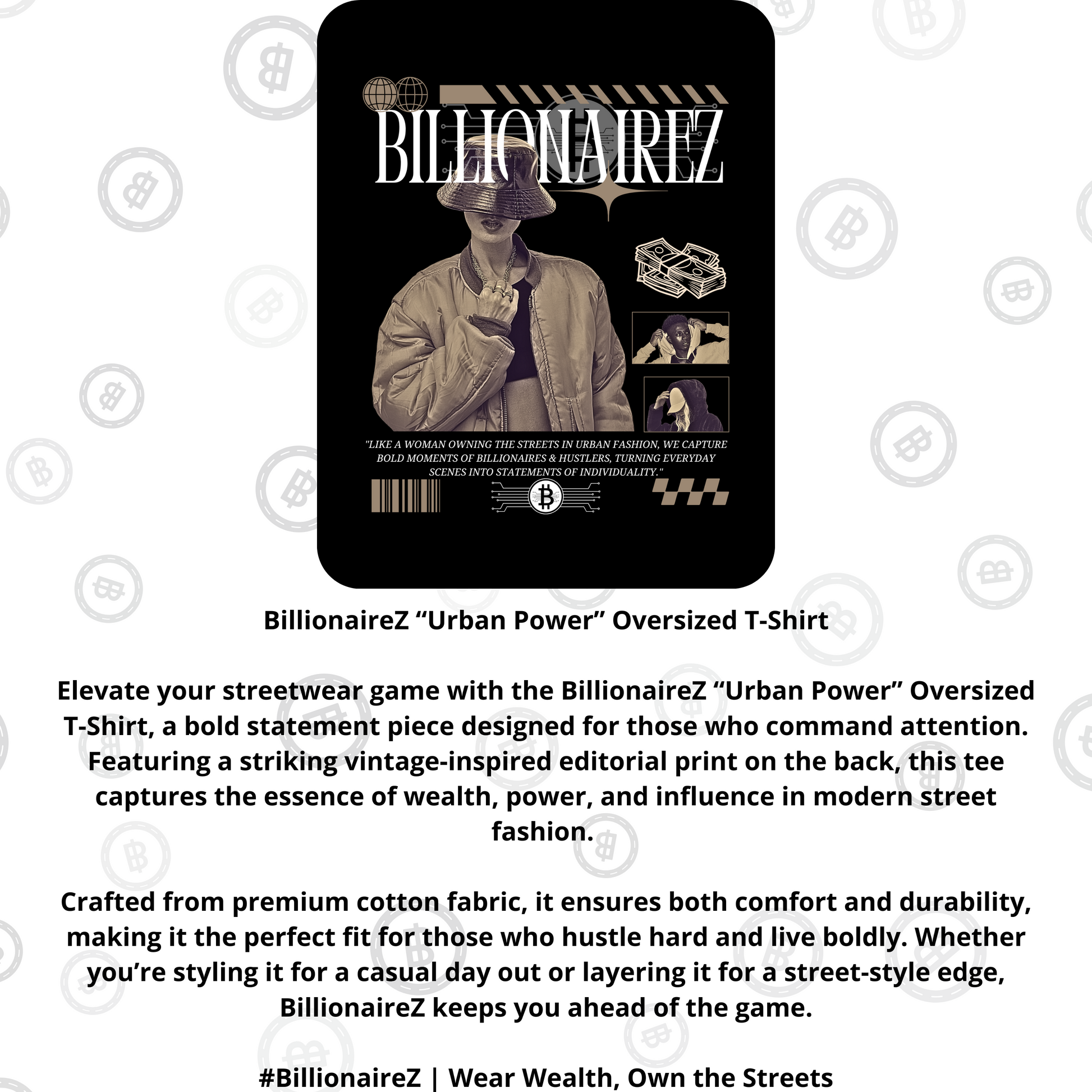 Elevate your streetwear game with the BillionaireZ “Urban Power” Oversized T-Shirt, a bold statement piece designed for those who command attention. Featuring a striking vintage-inspired editorial print on the back, this tee captures the essence of wealth, power, and influence in modern street fashion. Crafted from premium cotton fabric, it ensures both comfort and durability, making it the perfect fit for those who hustle hard and live boldly. Whether you’re styling it for a casual day out or layering it for a street-style edge, BillionaireZ keeps you ahead of the game.