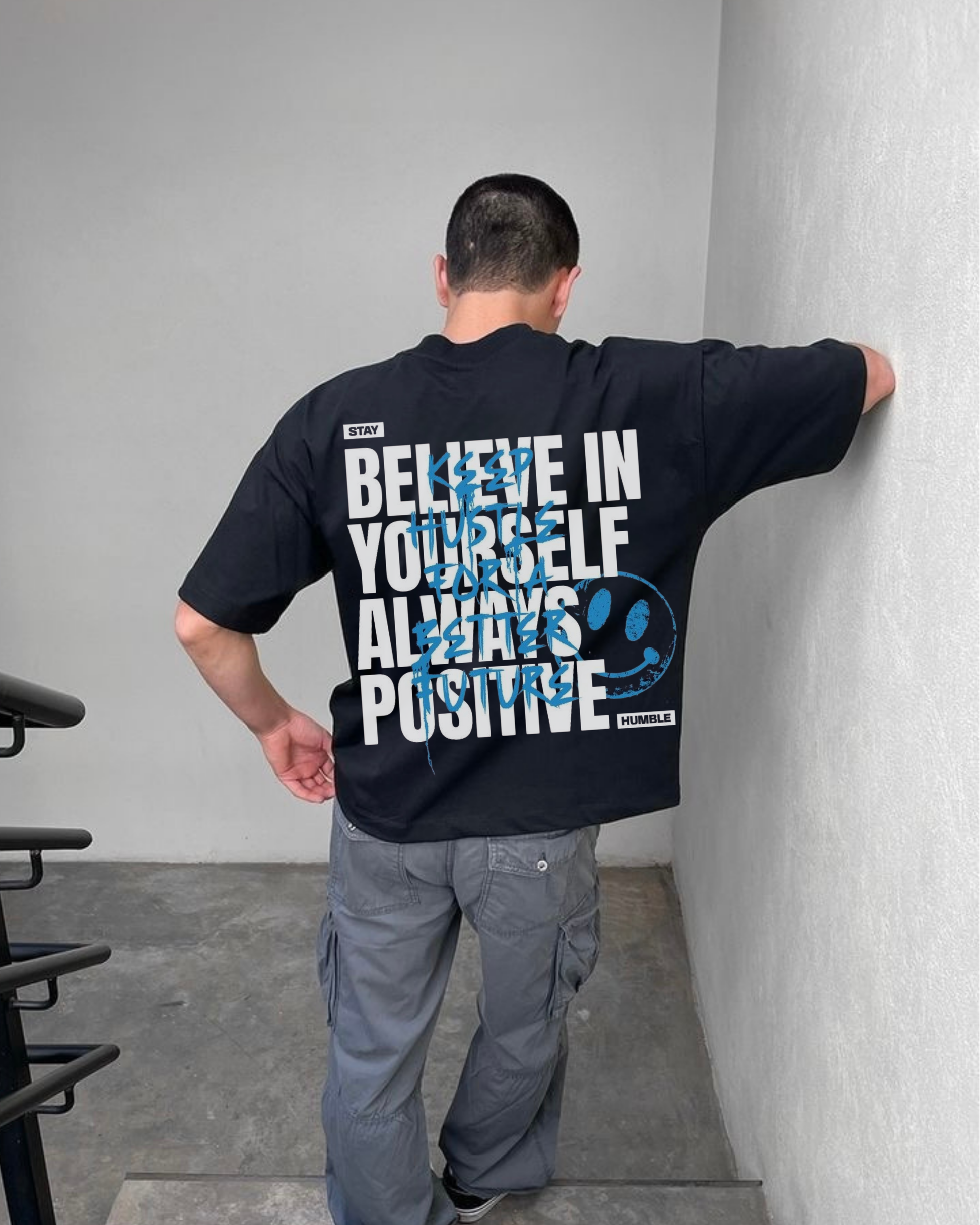 Featuring bold typography with an inspiring message on the back — “BELIEVE IN YOURSELF, ALWAYS STAY POSITIVE” — this tee reminds you to keep pushing forward no matter the challenges.