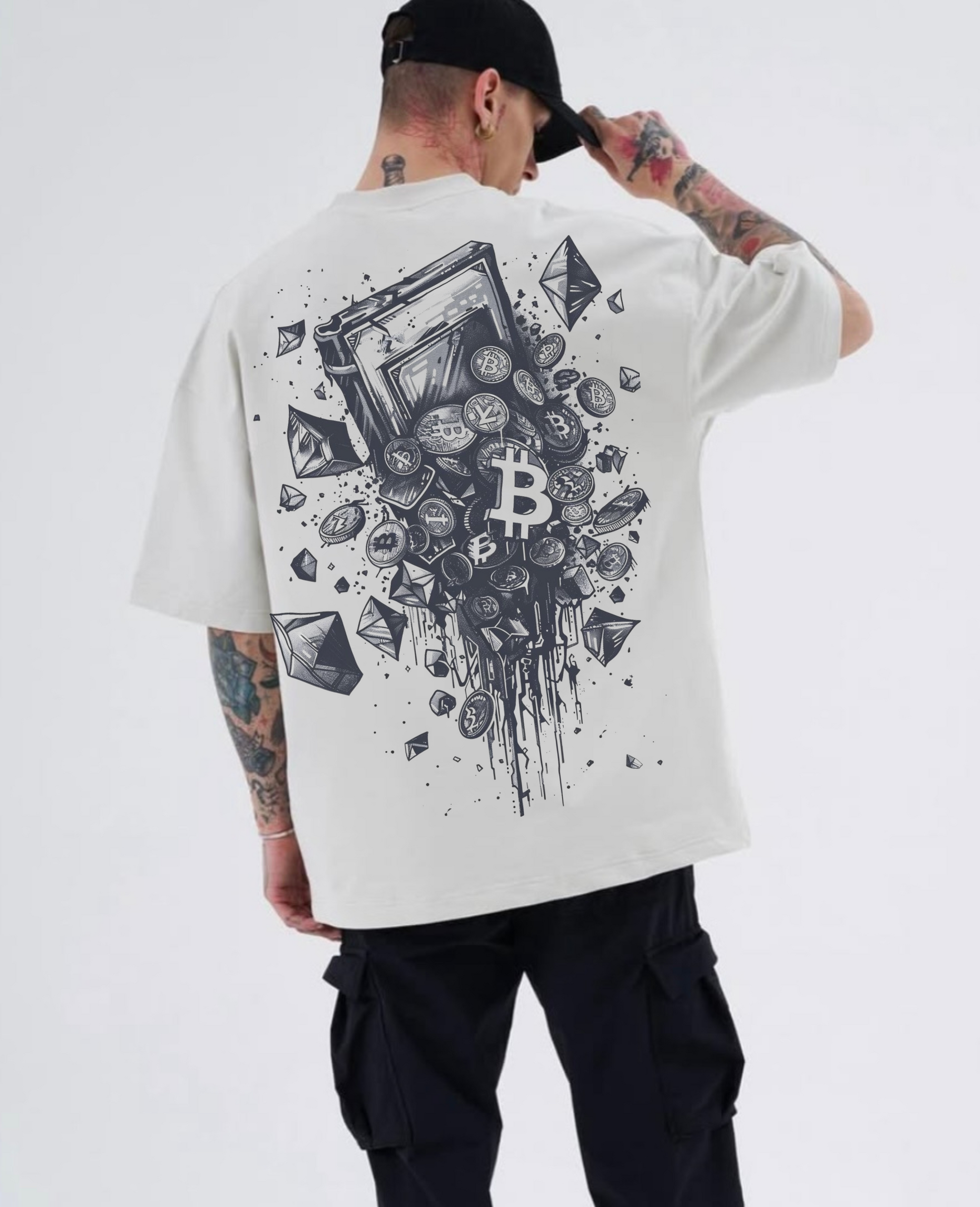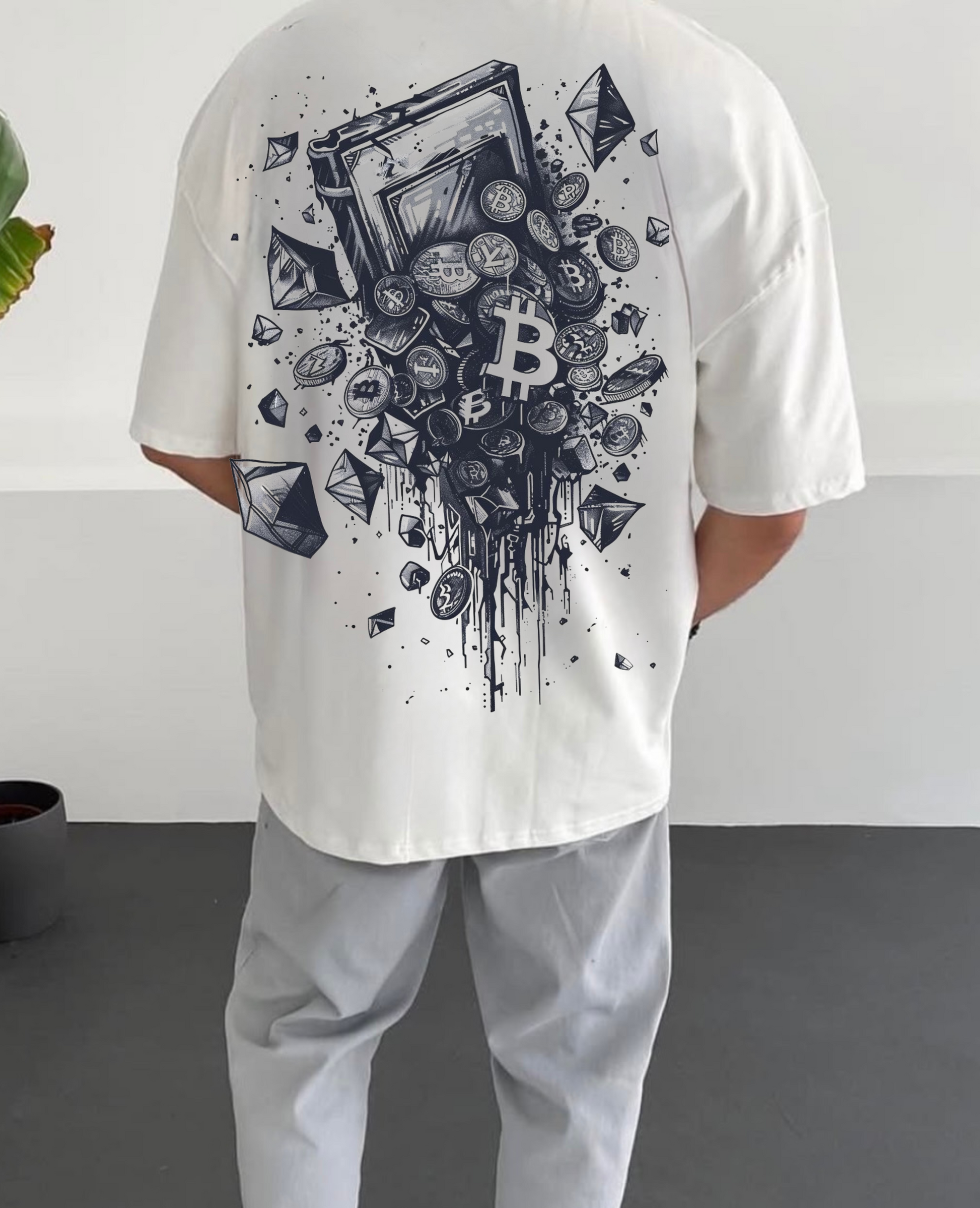 Drenched in digital dominance. The Crypto Drip oversized tee by BillionaireZ is a tribute to every hustler stacking coins and flipping blocks. Bursting with Bitcoin, Ethereum, and every gem in the cryptoverse, this tee is made for the future-forward and wallet-wise.